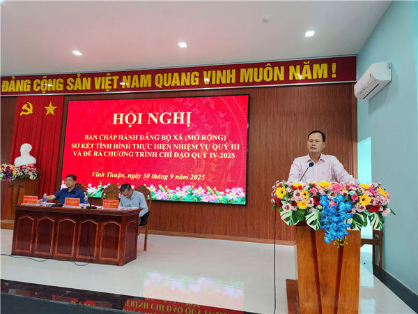 Ngày 30 tháng 9 năm 2025, Đảng ủy xã Vĩnh Thuận tổ chứcHội nghị Ban Chấp hành Đảng bộ (mở rộng) nhằm sơ kết tình hình thực hiện nhiệmvụ quý III và đề ra chương trình công tác, chỉ đạo trọng tâm trong quý IV năm2025.