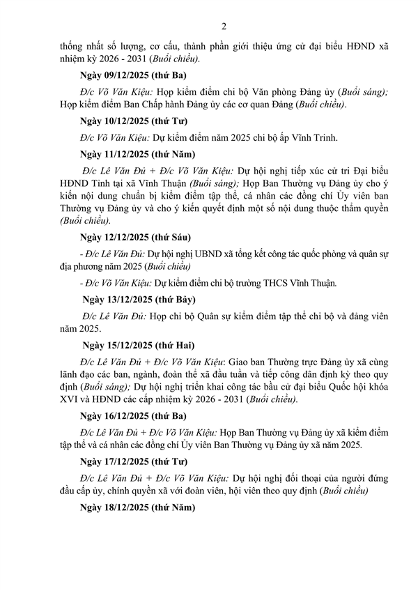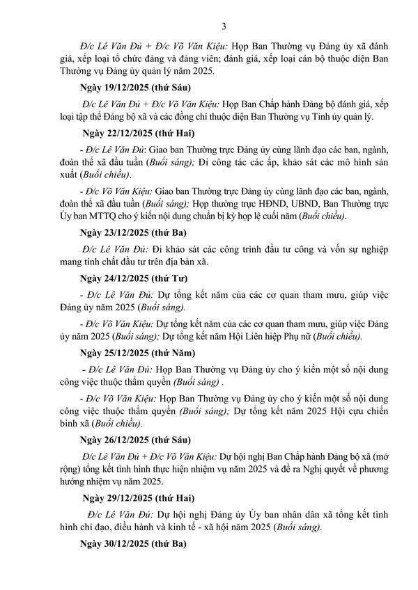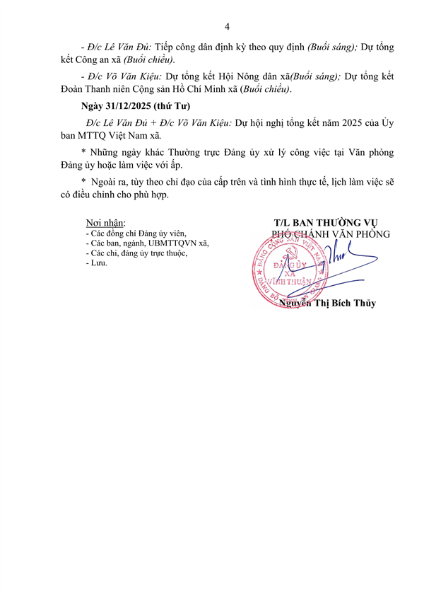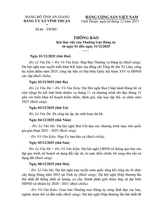 THÔNG BÁO LỊCH LÀM VIỆC CỦA THƯỜNG TRỰC ĐẢNG ỦY TỪ NGÀY 01 ĐẾN NGÀY 31/12/2025